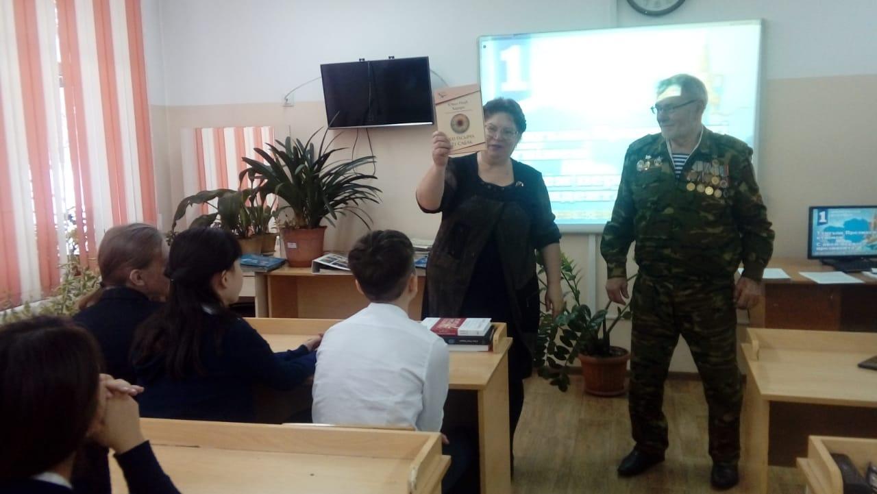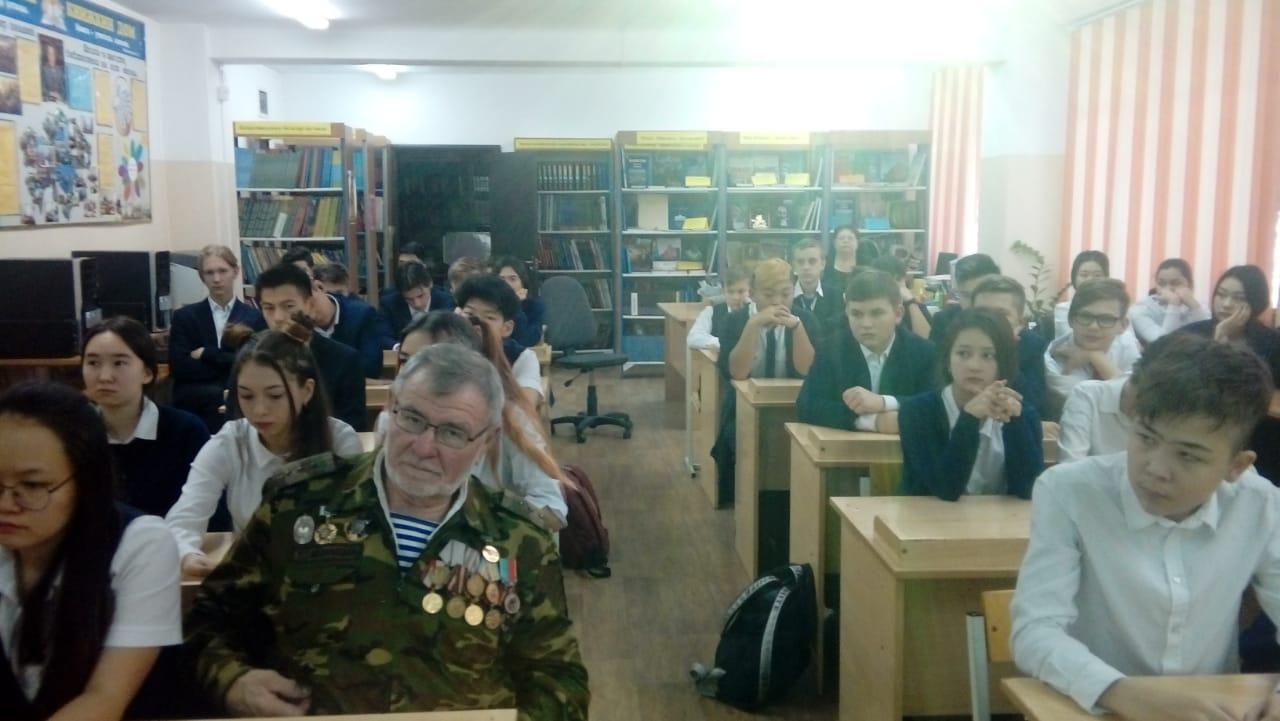 В школьной библиотеке "КГУ Гимназия 34" 29.11. 2019 г проведен круглый стол членов школьного военно- - патриотического клуба "Жас сарбаз" с приглашением воина - афганца Порядки В. И. На встрече была затронута тема Лидерства Елбасы, просмотрены биографические видео и фото материалы об Н. А. Назарбаеве.