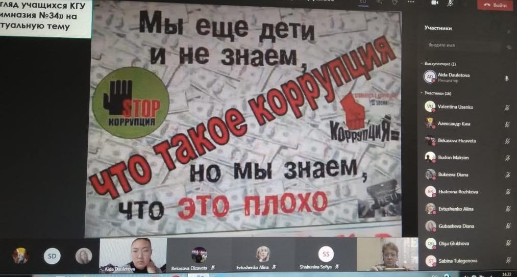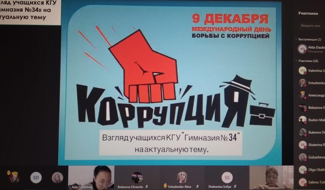 08.12.2020 г. в КГУ "Гимназия № 34" прошло внеклассное мероприятие среди учащихся девятых классов "Мы против коррупции". Мероприятие провела учитель предмета Основы Права - Даулетова Аида Сериковна. Ребята обсуждали очень непростую тему: "Что такое коррупция и как можно бороться с этим злом", делились своими мнениями. Встреча прошла продуктивно и интересно.