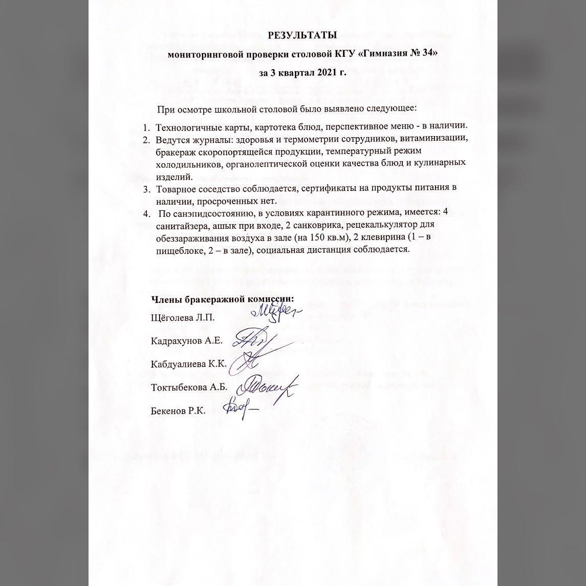 Акт бракеражной комиссии по проверке школьной столовой от 22.01.2021г