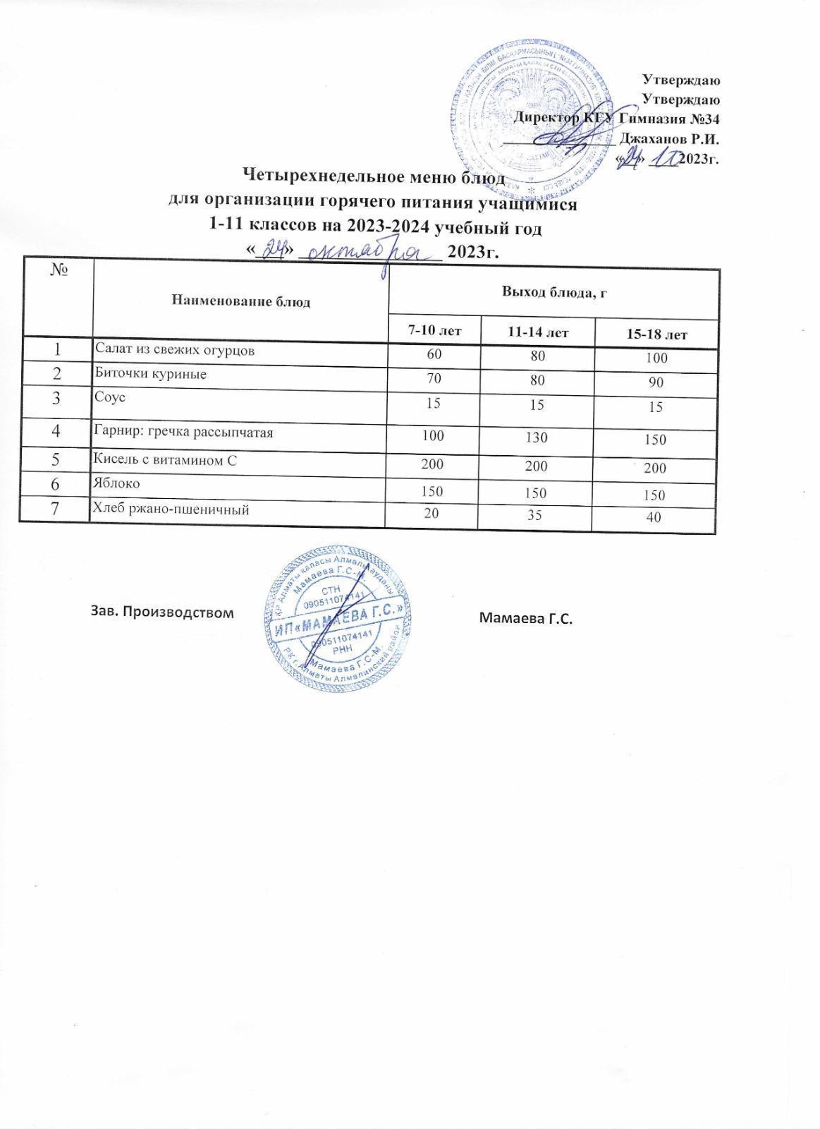 24 октябрь 2023 0 1 2 3 4 5 Четырехнедельное меню блюд для организации горячего питания учащимися 1-11 классов
