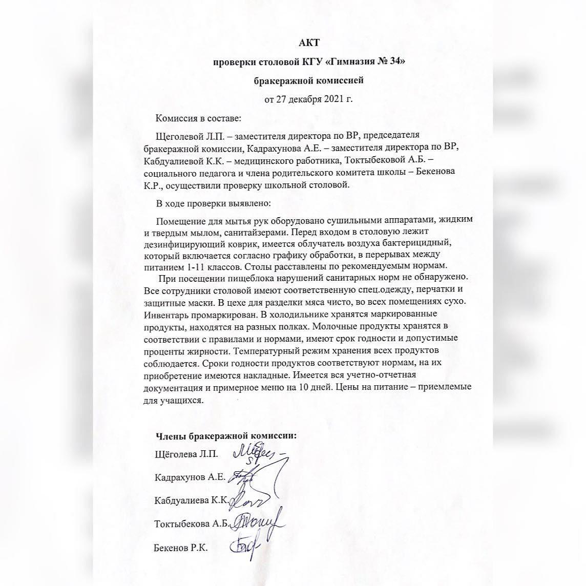 Акт бракеражной комиссии по проверке школьной столовой от 22.01.2021г